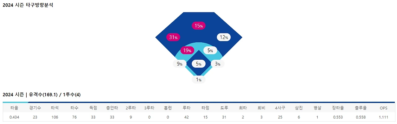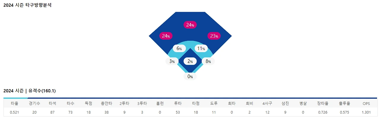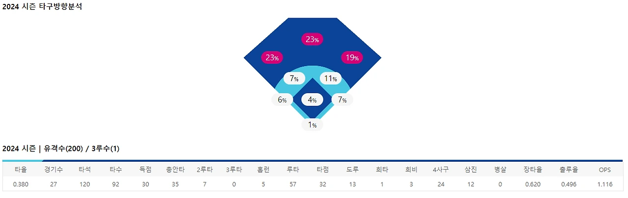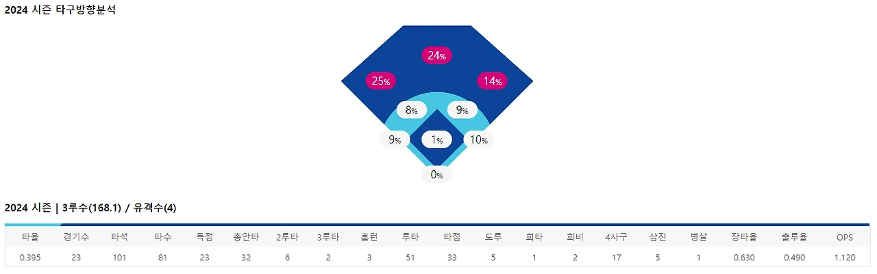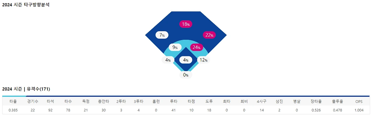 이런 갖다맞추는 스윙 덕인지는 몰라도, 홈런이 아예 없다. 사실 스윙의 결 자체가 나쁘지 않은 순간들도 분명 있으나, 전체적으로 홈런을 노리거나 뜬공을 통한 장타를 얻어내기는 힘들다는 것이 필자의 생각.