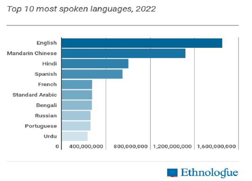 <Ethnologue: Languages of the World>는 2022년 세계 언어 중 가장 많은 사람들이 사용하는 언어 리스트를 발표했다. 영어가 1위 (15억명)이고 중국어가 2위(11억)명 이었다. 하나의 민족이 사용하는 중국어를 제외하고 세계 각국의 사람들이 함께 사용하는 언어 중에 가장 사용자가 많은 언어가 영어라는 사실에 우리는 주목할 필요가 있다. 영어 사용자 수를 현재 세계 인구(UN의 11월 보고자료, 80억명)와 대비하면 18.75%로 거의 20%에 가까운 숫자이다.