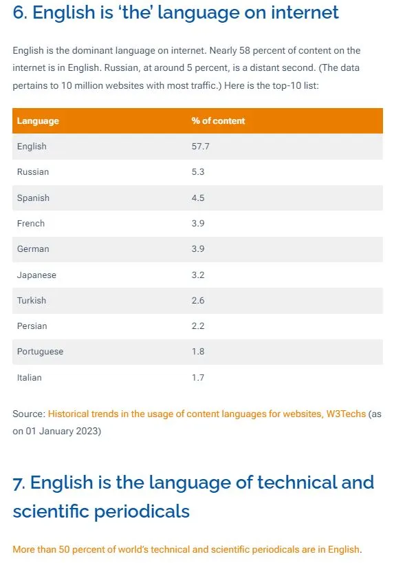 한편, W3Techs는 “World Wide Web Technology Surveys”로 세계적으로 사용되는 웹 플랫폼과 프로그램 등의 사용통계를 리서치해서 공개하고 있는 연구 단체로 W3Techs (https://w3techs.com의 공식적 자료에 따르면 온라인 상 정보의 57.7%가 영어로 전달된다고 한다. 또한 기술과 과학의 정기 간행물들의 50% 이상이 영어로 전달된다고 한다.