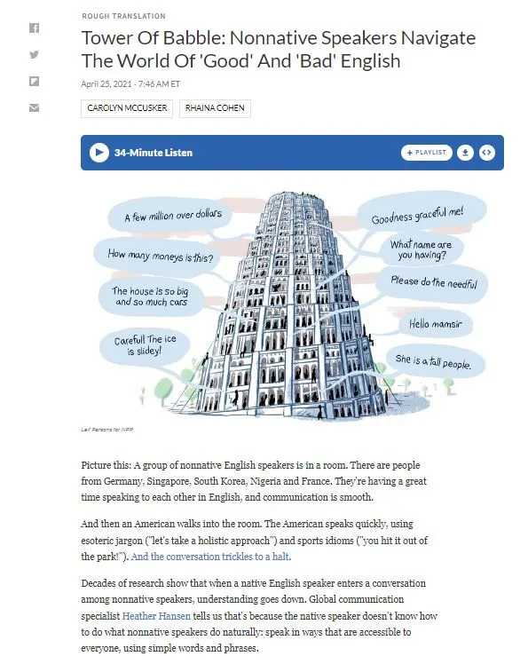 영어가 모국어가 아닌 다양한 나라 사람들이 모여 이야기를 나눈다. 그들의 말은 소위 문법적 오류가 많이 발견된다. 그럼에도 불구하고 즐겁고 막힘없는 소통이 이루어진다. 하지만 이 공간에 영어 원어민이 들어와 엄청 빠르고 은어(특정 부류의 사람들 사이에 통용되는 말이나 용어)나 숙어 표현를 사용함과 동시에 소통은 서서히 멈추게 된다. 글로벌 커뮤니케이션 전문가인 Heather Hansen은 원어민이 아닌 사람들은 쉬운 단어나 구문을 사용해서 모든 사람에게 이해가 되도록 한다는 사실을 영어 원어밈들은 잘 모른다는 것이다.
