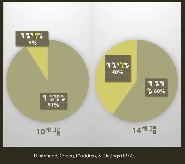 한편, Whitehead,Capey,Maddren & Wellings (1977) 연구에서는 8000명 영국 어린이들이 독서를 얼마나 즐기는지 조사를 했다. 10세 그룹의 경우 9%의 아이를 제외하고 대부분의 아이들은 책을 읽는 다고 설문했지만 14세 그룹의 경우는 40%나 달하는 아이들이 책을 안 읽는다고 대답했다고 한다. 이 결과를 좀 더 쉽게 풀어 말하자면, ‘초등학교 시절에는 책을 안 읽는 아이가 10명에 1명 정도는 되는 아주 극소수인 셈이었지만 중학생이 되면 2명 중 1명은 책을 안 읽는다’는 것이다.