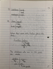 별도의 문법 공부를 시키지 않았다. 미국 초등학교 시절 동안 이렇다 할 명시적 영어 문법 규칙을 배운 적이 없는 둘째는 그럼에도 불구하고 긴 영어 문장을 잘 읽어낸다. 그 아이가 한 것은 대부분 영어 원서책 읽기였다. 읽기를 통해 기본적인 영어 문장 구조에 익숙해졌다. 미국 초등학교에서 유일하게 배운 명시적인 영어 문법은 문장을 다이어그래밍하는 것이었다. 아들의 문법 노트에는 문장 다이어그래밍(sentence diagramming)이 많이 기록되어 있었다.