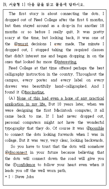 고등학교 내신 영어는 지필평가와 수행평가가 있다. 지필평가에는 선다형과 서술형이 출제 된다. 선다형은 수능 영어와 같은 스타일의 객관식 문제이다. 하지만 서술형은 다음의 예시에서도 알 수 있듯이 글을 읽고 영어 문장으로 답을 쓰는 문제가 많다.