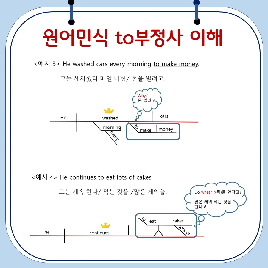 그들이 배운 to부정사의 00용법으로 영어 예문을 설명하지 않고 원어민식 문장 다이어그래밍으로 설명하자 40대 50대 엄마들은 눈이 동그래진다. 뭔가 미련이 남는 듯이 “그래도 우리나라에선 우리나라식 영문법을 해야 하지 않나요?”라 말씀하신다.