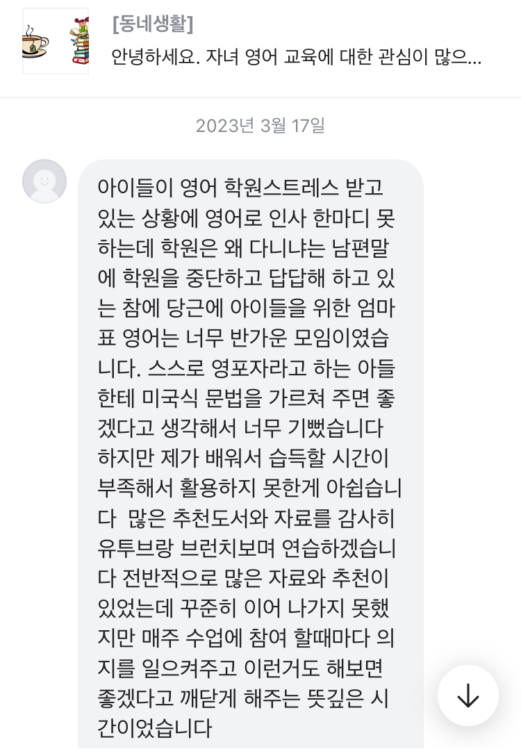 매주 꾸준히 오시는 엄마들의 수가 늘었고, 감사의 메시지를 보내시는 분들도 계셨다. 나의 배움이 남에게 도움이 될 수 있음을 실질적으로 느꼈다. 그리고 무엇보다 이번 프로젝트는 나의 작은 구슬들을 꿰어 볼 수 있는 좋은 경험이었다.