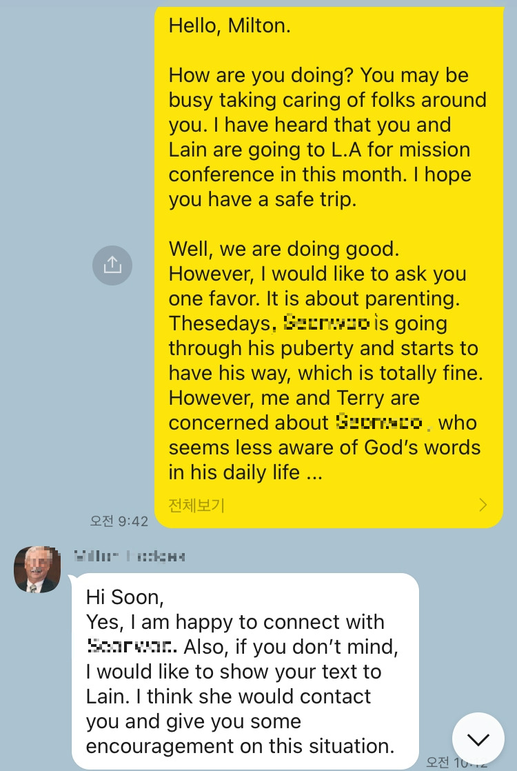 전날 남편과의 대화로 어느 정도 마음을 내려놓은 후 다음 날 아침 출근 후 바로 미국에 계시는 밀튼 할아버지에게 도움을 요청해보기로 했다. 예전 미국 교회 사립 학교에 다닐 때 아들은 성경 말씀을 곧잘 외우고 기도문도 쓰면서 신앙심을 키워갔다. 학교 친구들이 모두 신실한 믿음을 가진 가정의 아이들이라 우리 아들에게는 더할 나위 없이 좋은 또래 친구였다. 그런 세월을 뒤로 하고 귀국한 요즘엔 아들에게 그런 친구가 없다. 가끔씩이라도 밀튼할아버지의 안부 문자가 아들에게는 그 시절 배움을 상기시켜주는 좋은 계기가 될 것 같았다. 비록 몸과 마음이 변하는 시기이지만 그 시절 배운 성경 말씀은 늘 마음에 큰 중심이 될 수 있었으면 했다. 그런 나의 마음을 밀튼 할아버지께 카톡 문자로 전했다. 그것도 출근 후 바로 당장 보냈다.