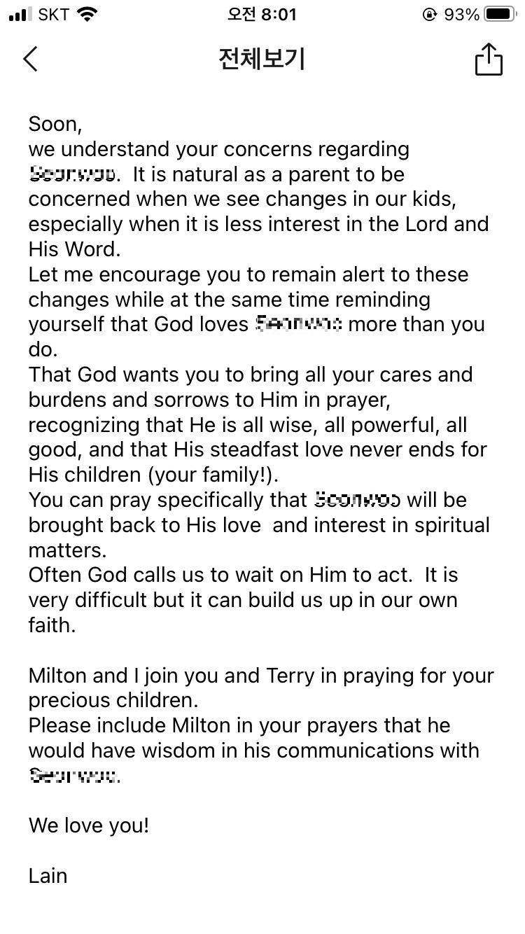 아들과 관련한 너의 염려를 충분히 이해한다. 특히 아이들이 하나님과 하나님의 말씀에 덜 흥미를 느낀다는 생각이 들 때 부모로서 염려가 되는 것은 아주 자연스럽다. 이런 아들의 변화를 늘 알아차리고 동시에 하나님이 너보다 더 아들을 사랑함을 잊지 않기를 바란다. 또한 하나님은 너의 모든 염려와 부담감, 슬픔을 기도로 올리기를 원하신다. 너는 하나님이 현명하시고 전능하시고 늘 선하시고 너와 너의 가족에 대한 하나님의 사랑은 끝이 없음을 기억해. 특히 아들이 하나님의 사랑으로 신앙심에 관심을 가질 수 있도록 기도해. 하나님은 그가 행동하실 때 까지 우리가 인내하며 기다리기를 원하신다. 그건 힘들지만 우리는 믿음으로 견딜 수 있어. 밀튼과 나도 너의 아이들을 위한 기도를 해줄게. 밀튼이 너의 아들과 더 소통을 잘 할 수 있는 지혜를 가질 수 있도록 기도하자.
