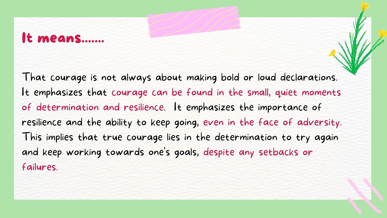 용기는 때로는 하루 끝에 "내일 다시 시도해볼 거야"라고 조용히 내뱉는 목소리이다. "