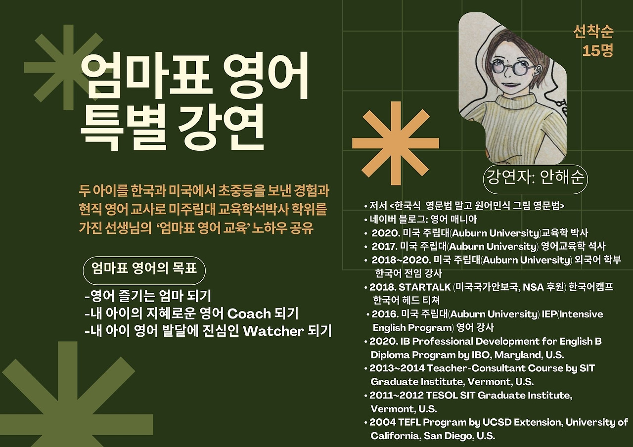큰 용기를 내어 올 초에 시작한 엄마표 영어 티타임이 한 해의 한 중간에서 중단 위기에 처해있었다. 그럼에도 다시 에너지를 재충전하여 시도하는 이번 엄마표 영어 여름 특별 강연은 나에게 참 특별하다.