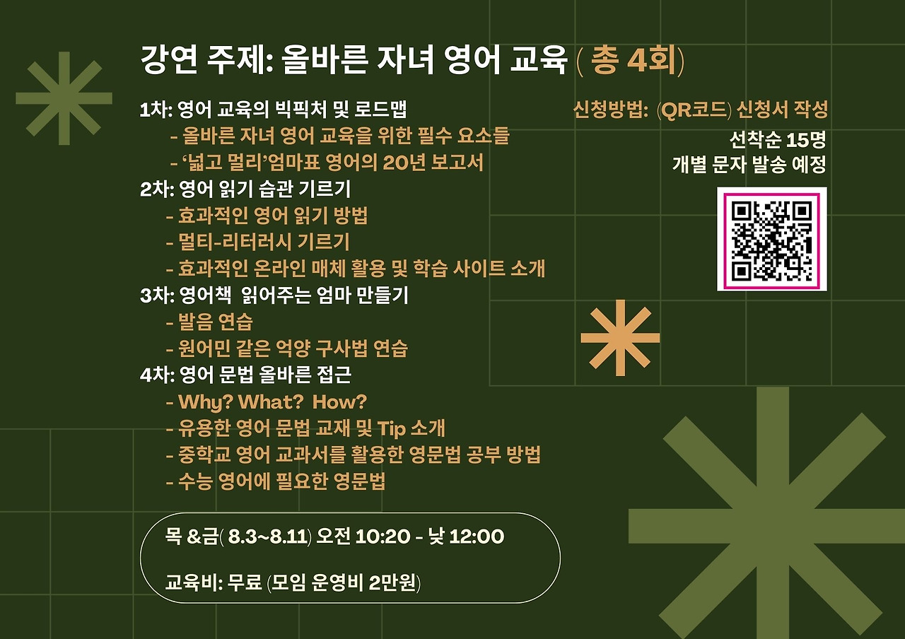 지난 겨울 두 달간 엄마표 영어 티타임이라는 소규모 부모 교육을 진행하며 어느 정도 정리한 커리큘럼을 그냥 썩히기에는 내가 들인 열정과 수고가 너무 아까웠다. 그래서 10회에 걸친 그 컨텐츠를 4회로 압축하고 재정리하여 여름 방학과 겨울 방학을 활용해서 특별 강연으로 진행해보기로 계획을 대대적으로 수정했다. 물론 남편과 이런저런 방향성을 의논하다가 떠오른 아이디어였다.
