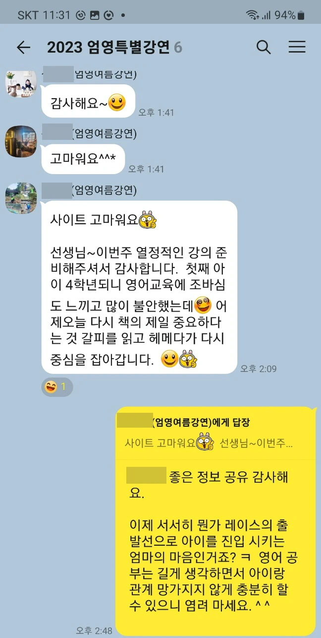 첫 날 강연은 엄마 본인의 학창 시절 영어 공부법과 영어를 싫어하고 못 하게 된 이유, 지금이라도 영어를 잘 하고 싶은 이유를 나누며 공감대를 쉽게 형성할 수 있었다. 그리고 자녀만큼은 올바른 방향으로 영어를 교육 시키고 싶어서 강연에 참여하게 되었다고 하셨다.