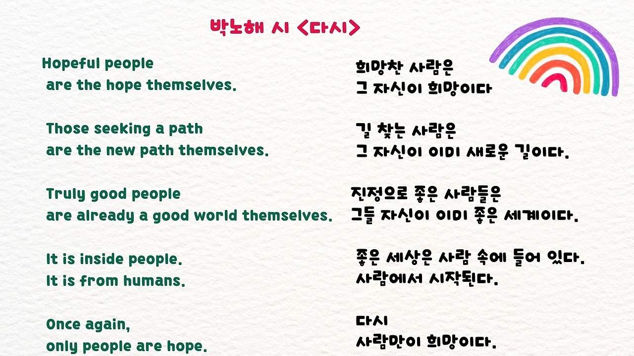 그리고 박노해의 <다시>라는 시도 나누었다. “다시 사람만이 희망이다.”라는 부분은 모두에게 무언가를 생각하게 만들기에 충분하다. 어떤 분은 최근 서로의 잇권을 챙기는 사람들로부터 마음 상한 일이 있어서 누군가와 가까이 지내는 것에 지쳤다고 하신다. 그런 와중에 오늘 함께 나눈 시의 내용이 마음을 다독여 주었다고 하신다. 희망찬 사람, 길 찾는 사람, 진정으로 좋은 사람들이 늘 세상에는 있고 그 사람 속에 좋은 세상이 있다는 시인의 말이 새로이 마음을 가다듬게 만든다고 했다.