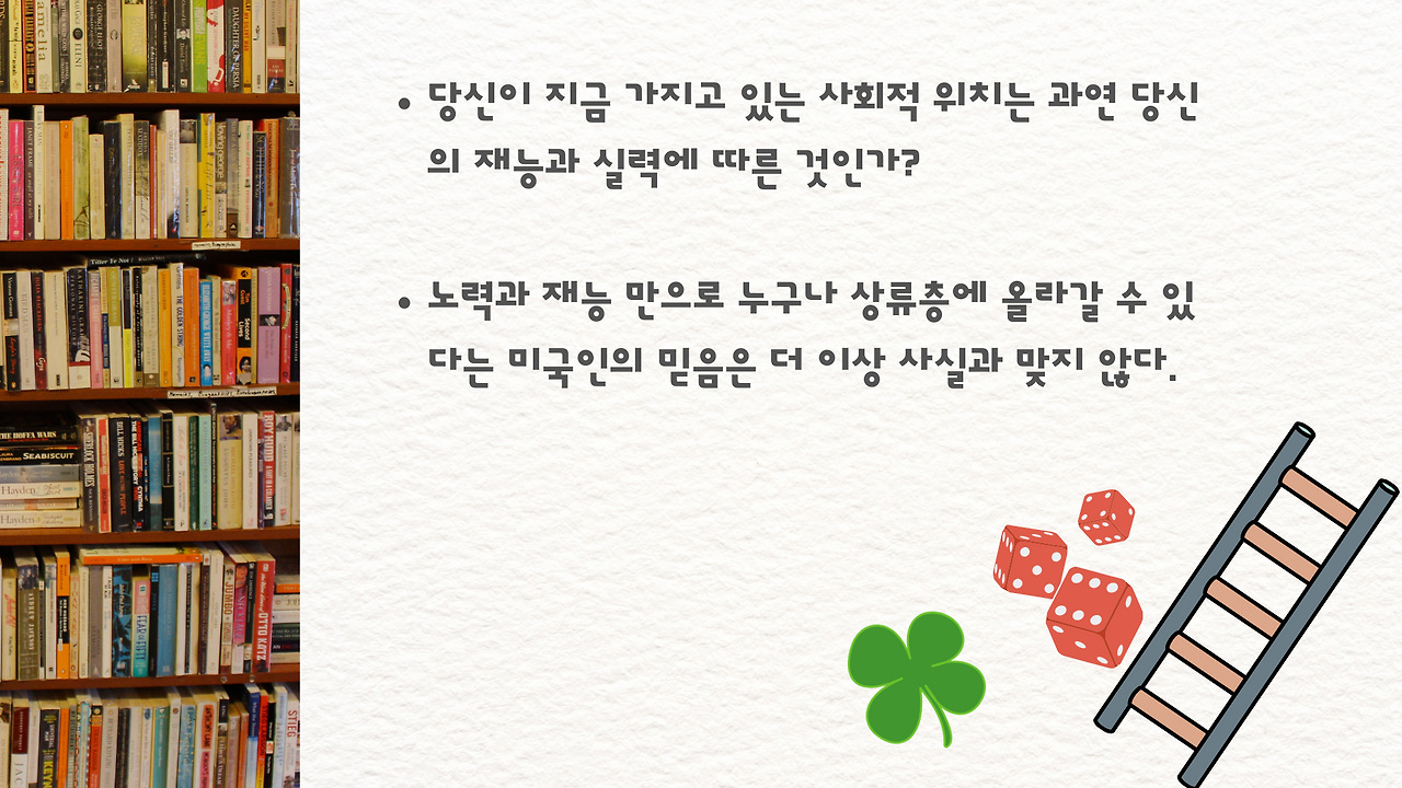 우리나라도 점점 미국의 모습을 닮아가고 있는 것 같아요. 가진 자와 성공한 자들의 성공과 부는 순수히 그들의 능력 때문이었을까요? 그렇지 못한 사람들은 단지 무능해서 그렇게 된 것일까요?