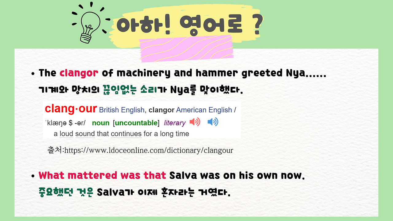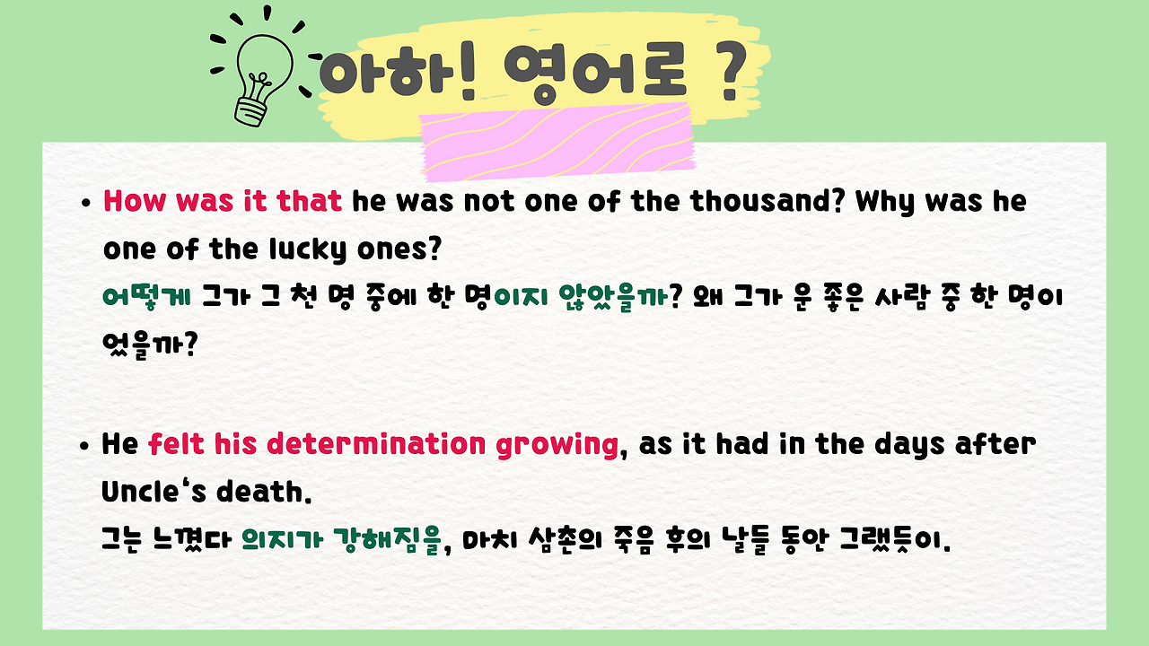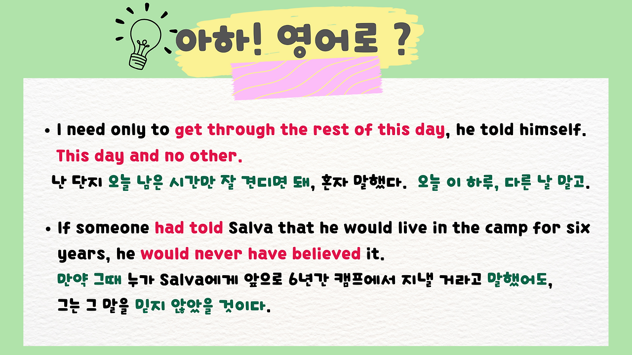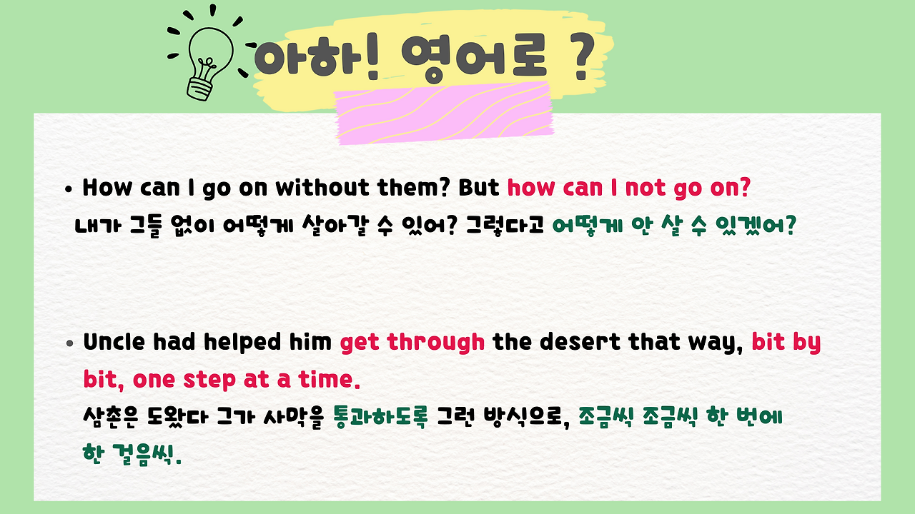 아래 표현은 제가 읽으면서 꼭 기억하고 싶거나 마음에 든 표현들이라 정리를 해봤습니다.