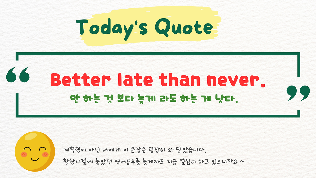 2. 오늘의 격언(Quote) : Never late than never.