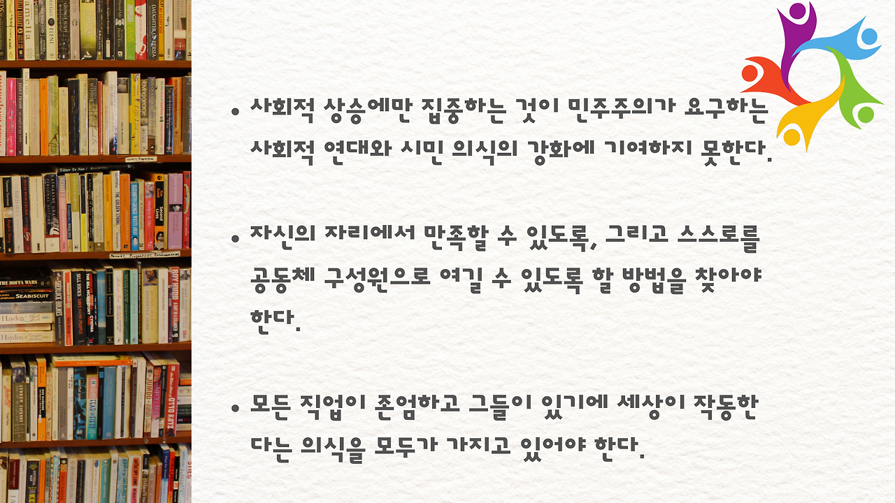 샌델 교수가 책의 결론 부분에서 말씀하신, "자신의 자리에서 만족할 수 있도록, 그리고 스스로를 공동체 구성원으로 여길 수 있도록 할 방법을 찾아야 한다."는 말에 너무 공감이 됩니다.