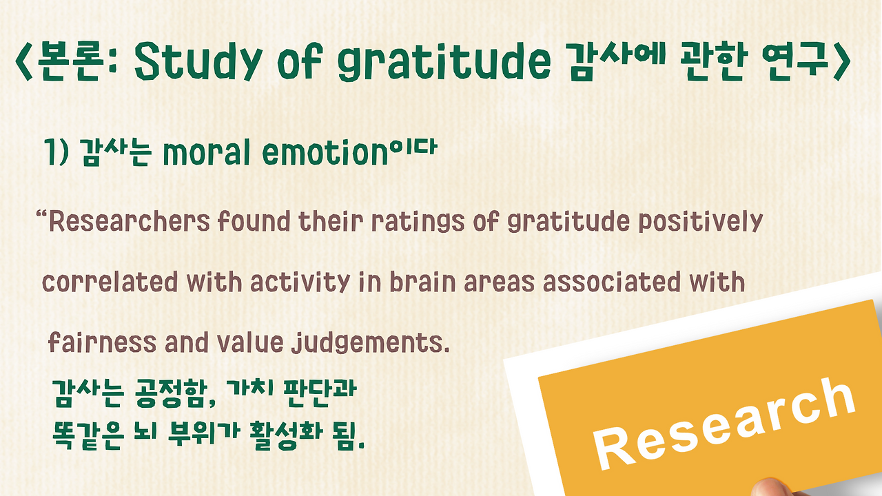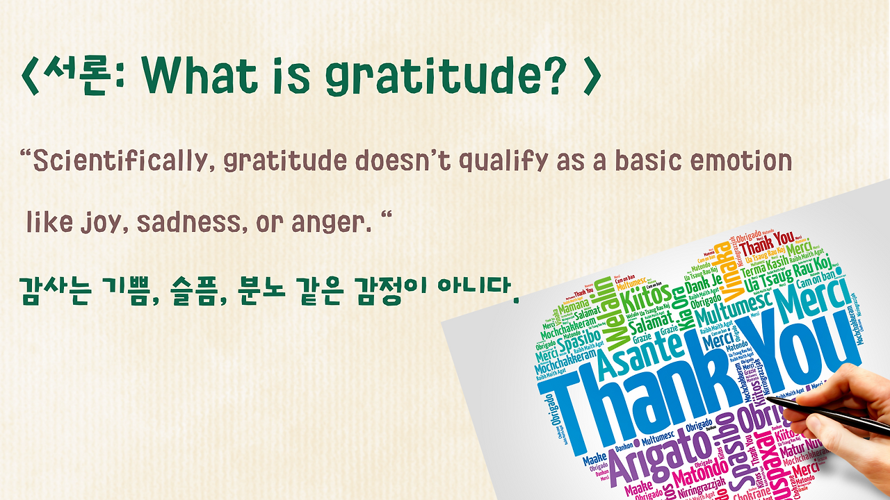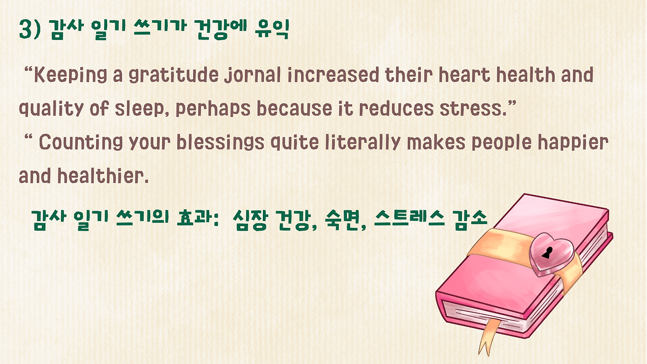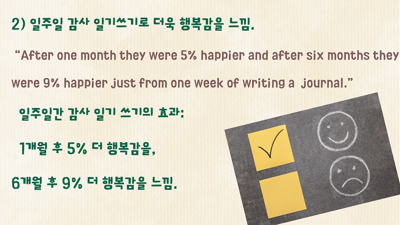원서를 읽고 나니 10분 정도 밖에 남지 않았어요. 하지만 지난 모임에 못한 영어 영상을 오늘은 하기로 했어요. TED 원장쌤이 준비한 영상의 주제는 감사의 과학적 효능입니다. 감사 일기를 일주일만 써도 우리는 1개울 후 5% 더 행복감을 느끼고 6개월 후 9% 더 행복감을 느낀다고 하네요. 감사하기, 나의 은혜받음을 세어 보기(Count Your Blessings)의 효과를 과학적으로도 밝힌 연구를 알아보았어요.