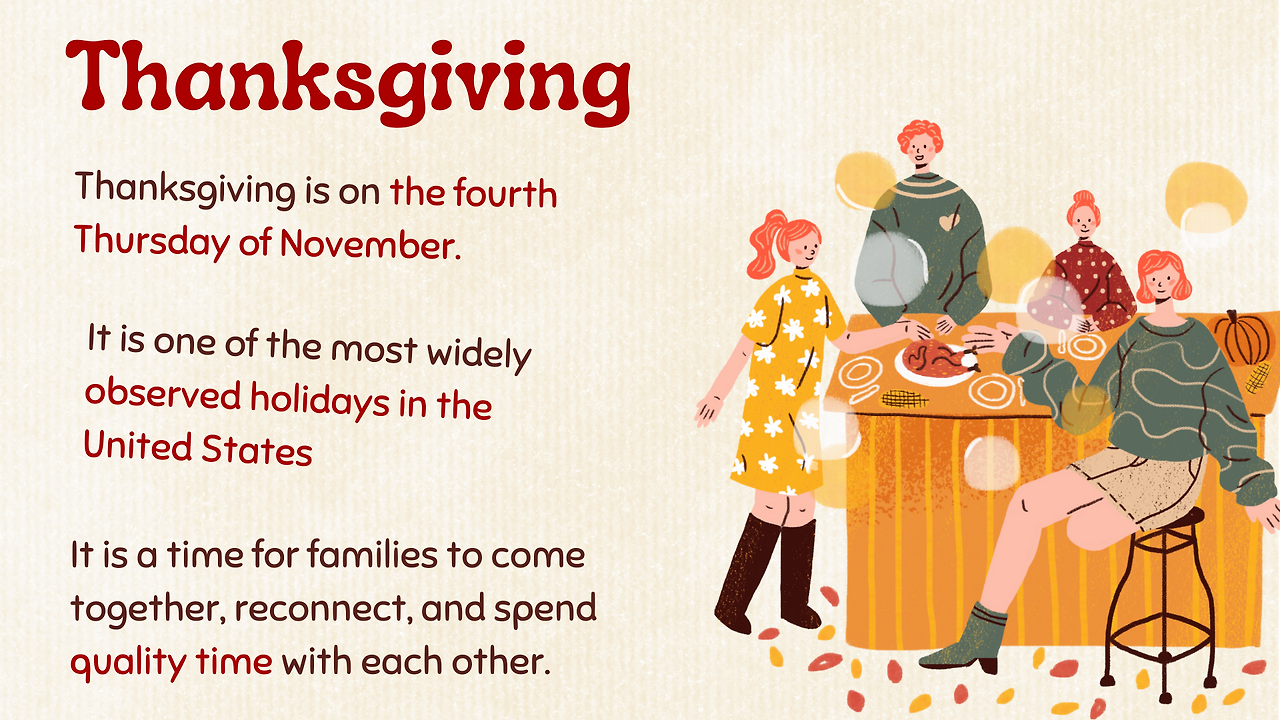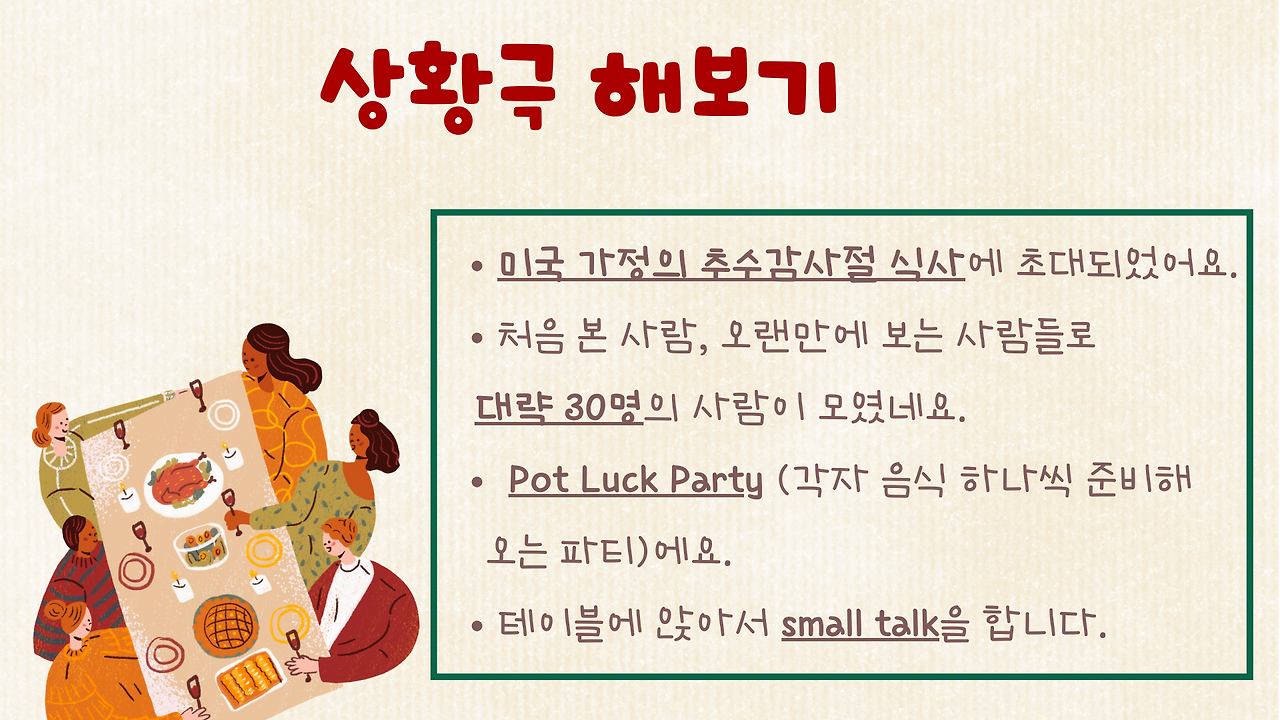 오늘은 저희가 미국 있을 때 추수 감사절 식사 초대에 찍은 영상을 보고 추수 감사절을 주제로 오늘 모임을 진행했어요. 오랜만에 만나는 사람들과 함께하는 식사 행사에 의례 해야 할 안부 묻기 및 일상에 대한 스몰 토크(small talk)를 직접 해보는 역할극 까지 했어요.