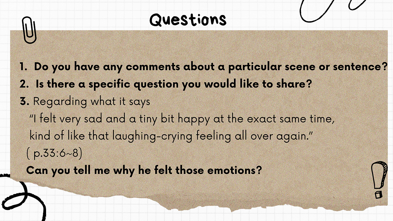 5. 영어 스몰 톡 : <Wonder> 읽은 부분에 대한 자유 토론 (영어든 우리말이든)