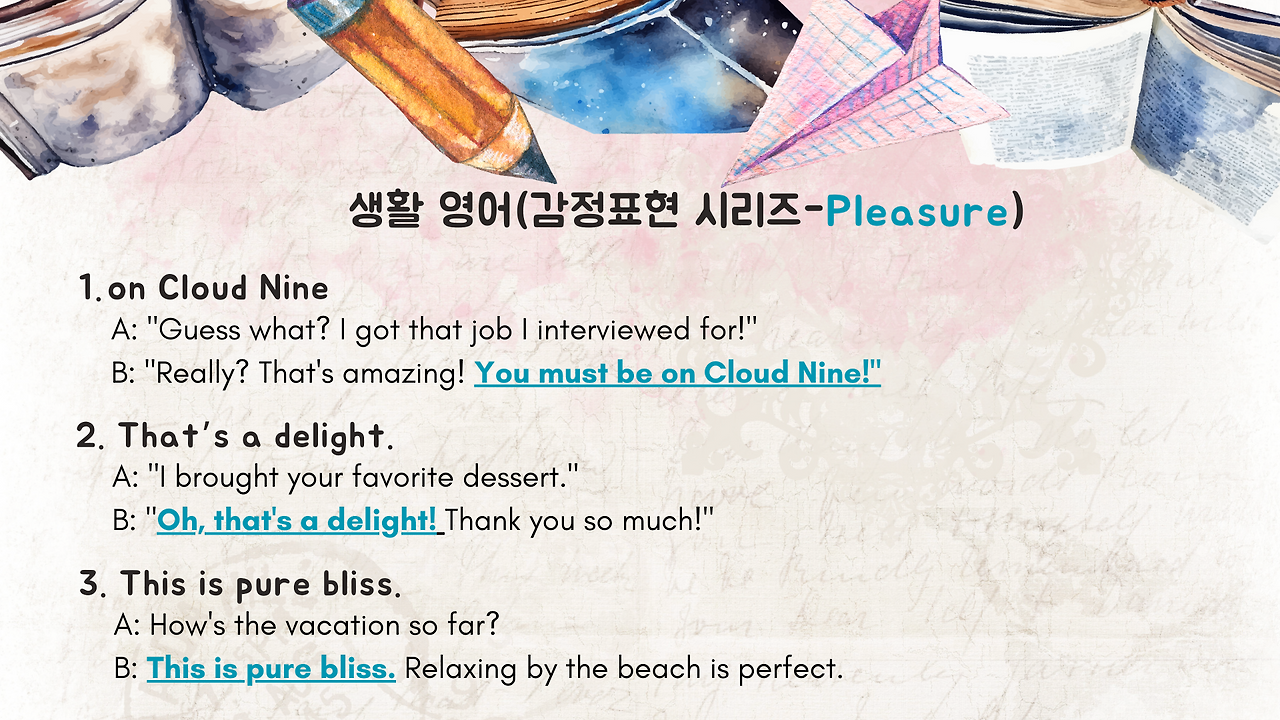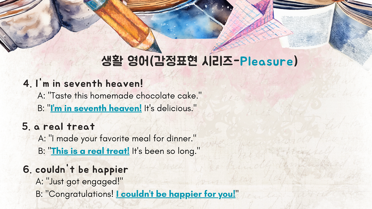 4. I'm in seventh heaven. : 이 표현의 유래는 확실하지 않습니다. 누구는 동양 사상에서 영향을 받은 표현이라 하지만 어쨌든 천국에도 등급이 있는 듯 천국 중 최고 단계에 있다는 듯이 행복함을 표현한 재미난 표현이네요.
