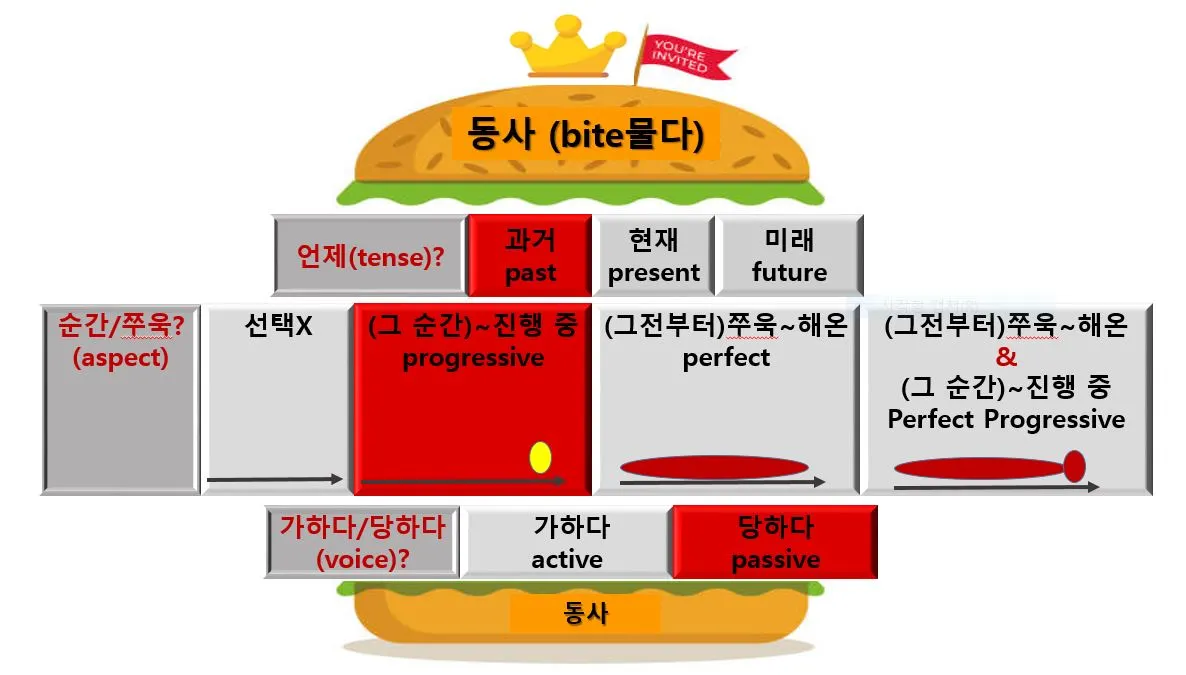 이 두 주인공 중에서 영어를 배우는 우리에게 부담을 주는 건 바로 동사이다. 그 한 단어(동사)에 장장 4가지의 정보가 압축파일처럼 포개져있기 때문이다. 마치 햄버거에 여러 재료를 넣는 것처럼 말이다.
