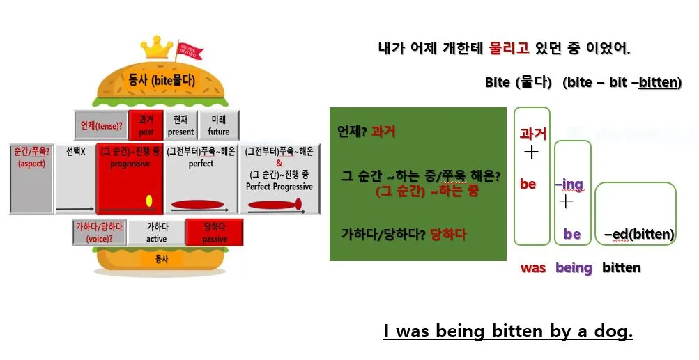 그래서 ‘내가 개한테 물리고 있던 중이야’는 시간(과거) + 진행인 양상(be-ing) + 피해자 입장 (be –ed)의 순으로 놓고, 서로 체인 엮듯이 엮어서 압축시키면 ‘was being bitten’이라는 형태가 나온다. 그래서 ‘내가 개한테 물리고 있던 중이야’라는 문장에서 동사인 ‘물리고 있던 중이야’는 ‘was being bitten’이 되는 것이다.