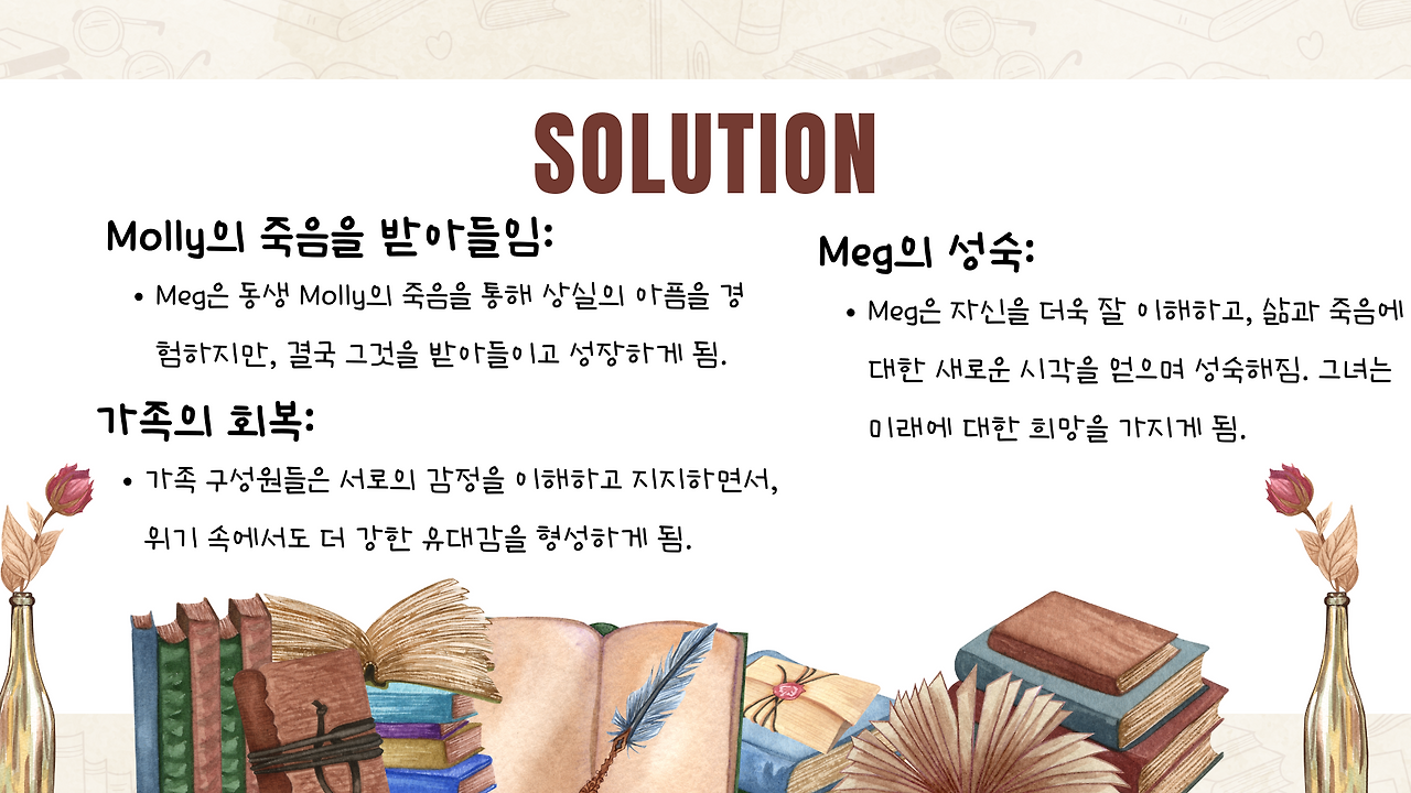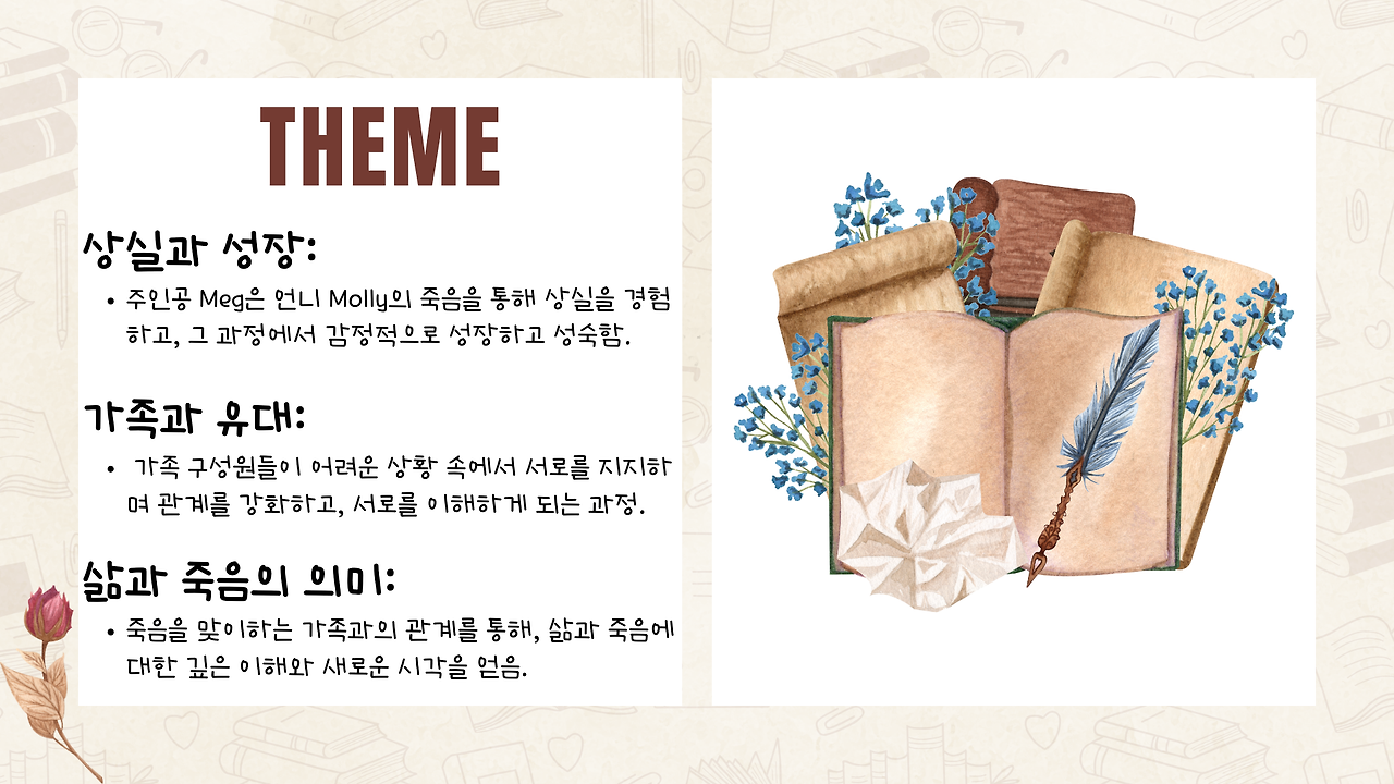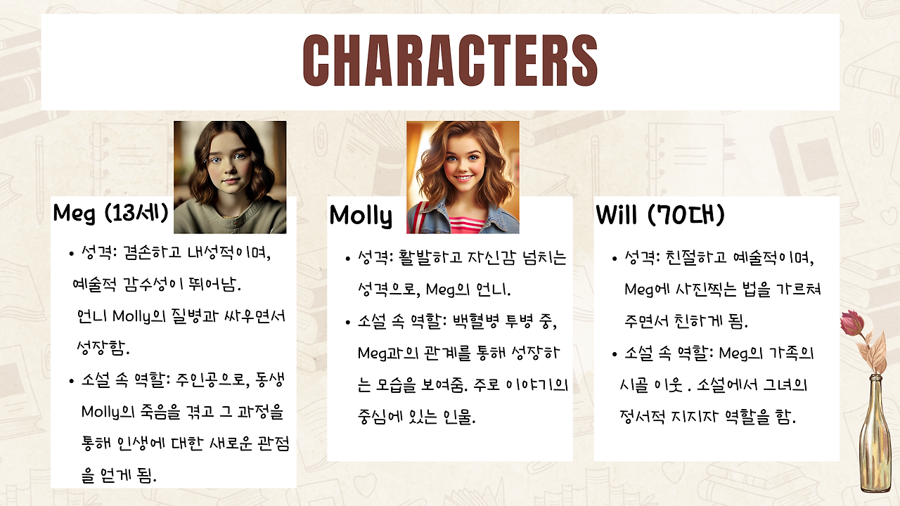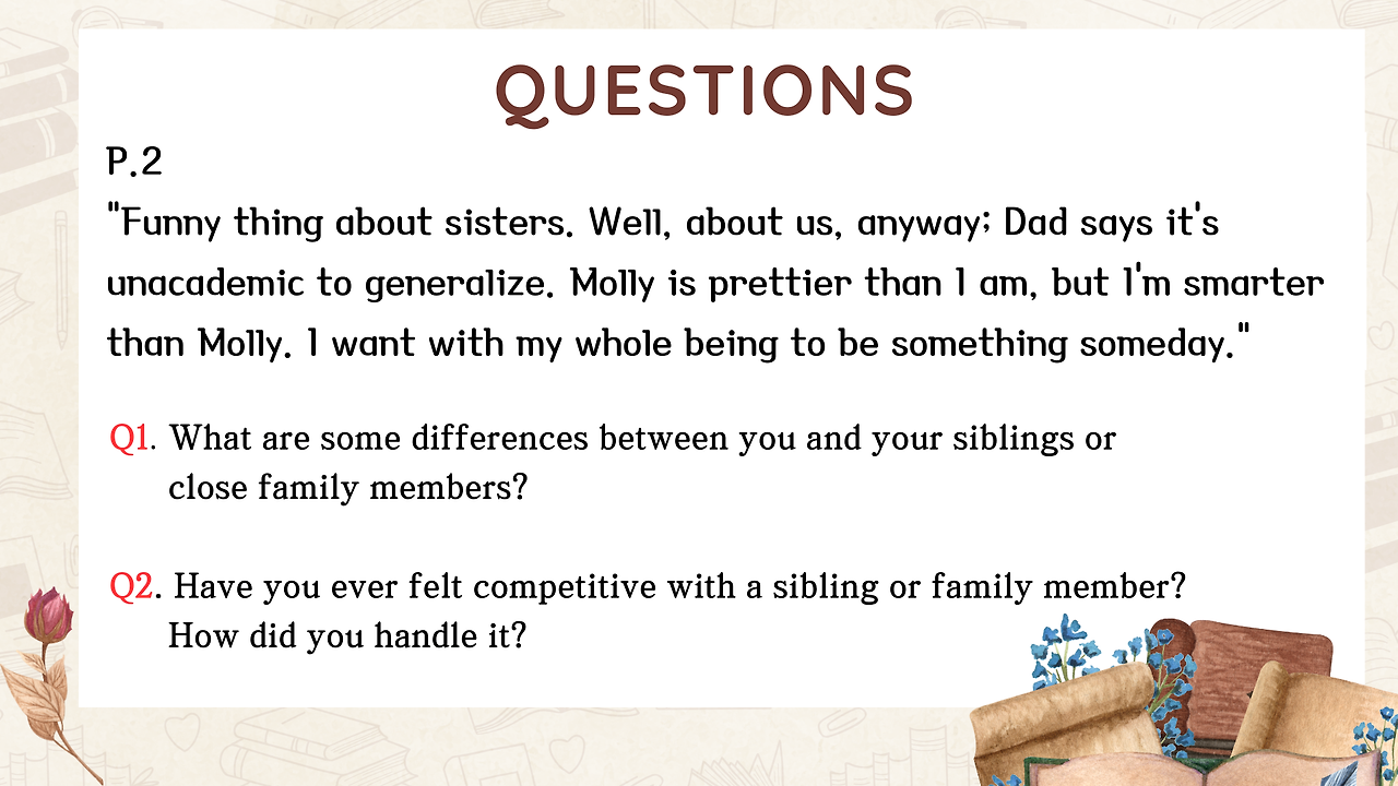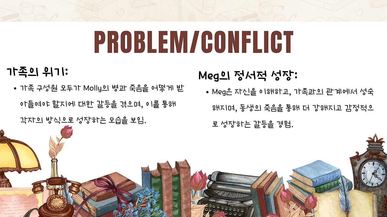 이번 모임부터 시작한 새로운 소설책 <A Summer to Die>을 읽습니다. 특히 오늘 읽은 Chapter 1에는 주인공인 13살 Meg은 예쁘고 활발한 언니 Molly에 대한 부러움을 드러내는 부분이 나옵니다. 하지만 또 한편으로 언니와 다른 자신을 인정하고 자신의 세계를 당차게 만들어가려는 그런 강한 의지도 내보입니다.