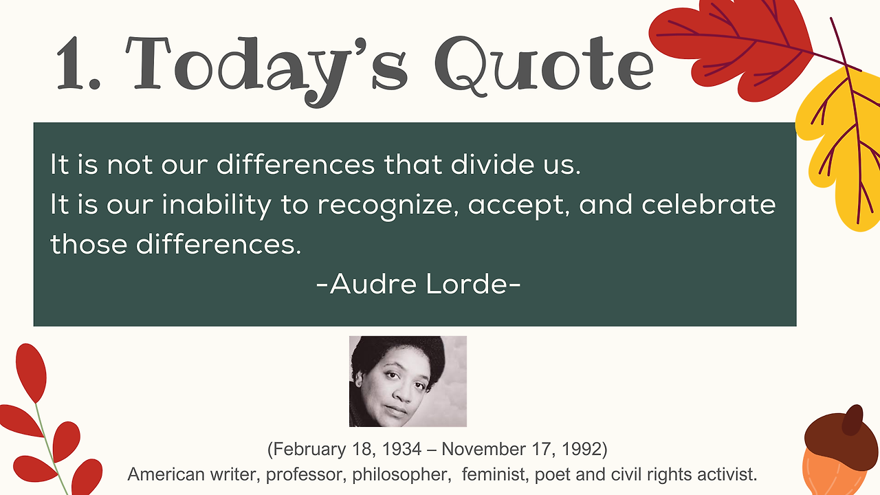Audre Lorde는 그 깊은 분열은 서로 다름을 "인식(recognize)"하고 "받아들이지 (accept) 못하고 그 다름에 대한 감사를 느끼지(celebrate) 못하는 우리의 아둔함 때문이라고 이야기를 하고 있습니다.