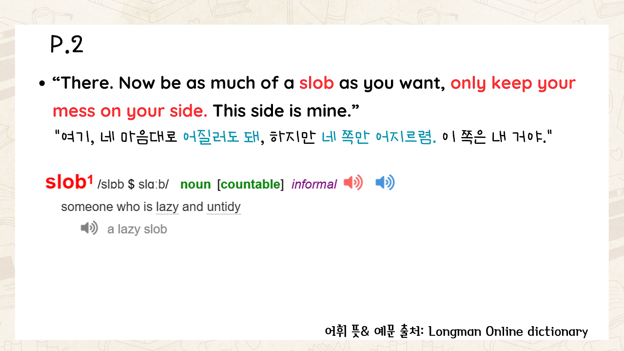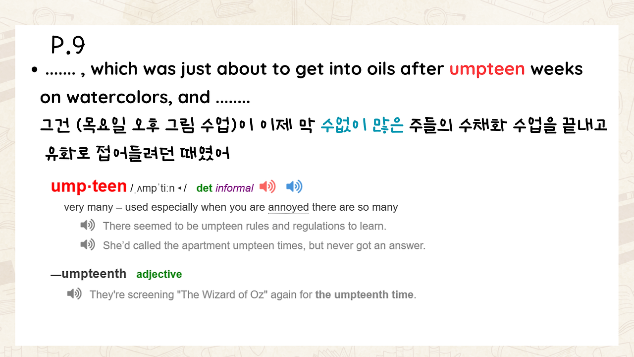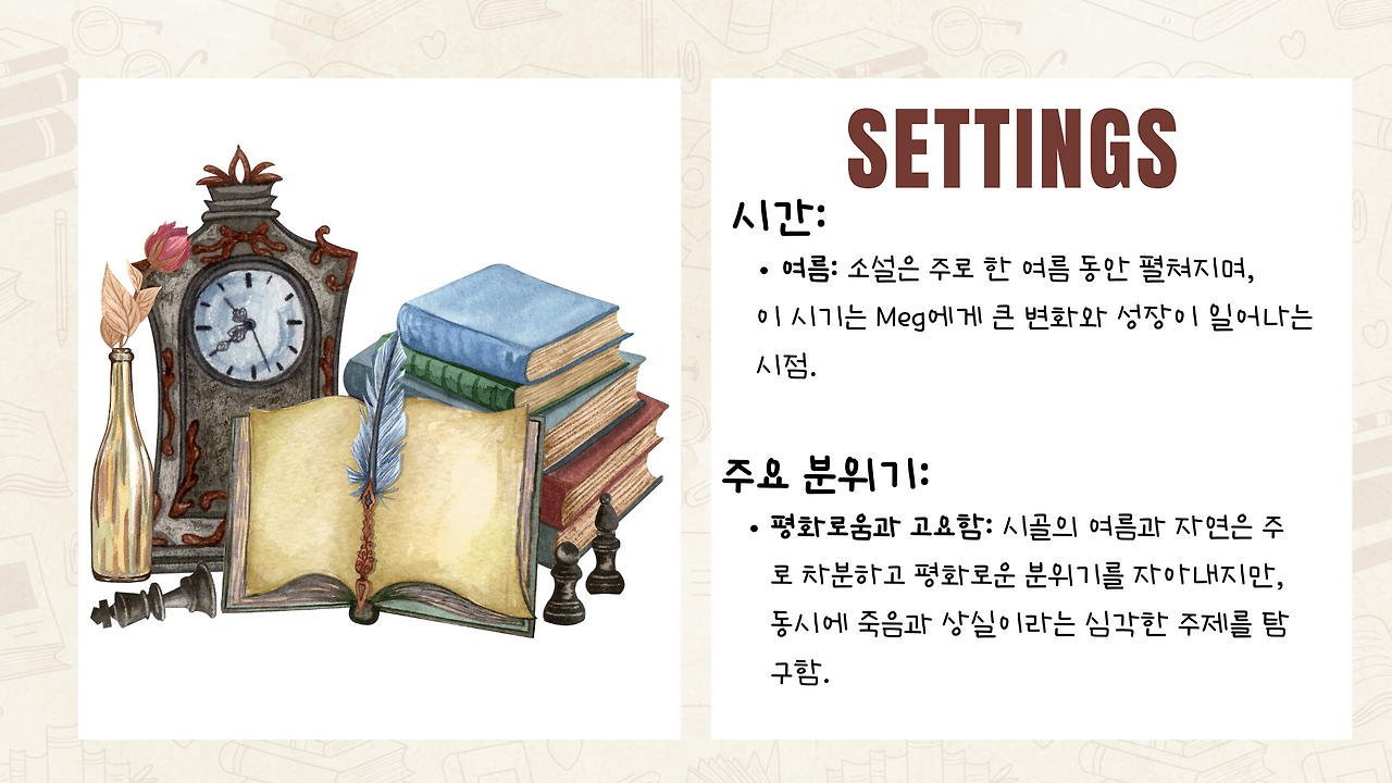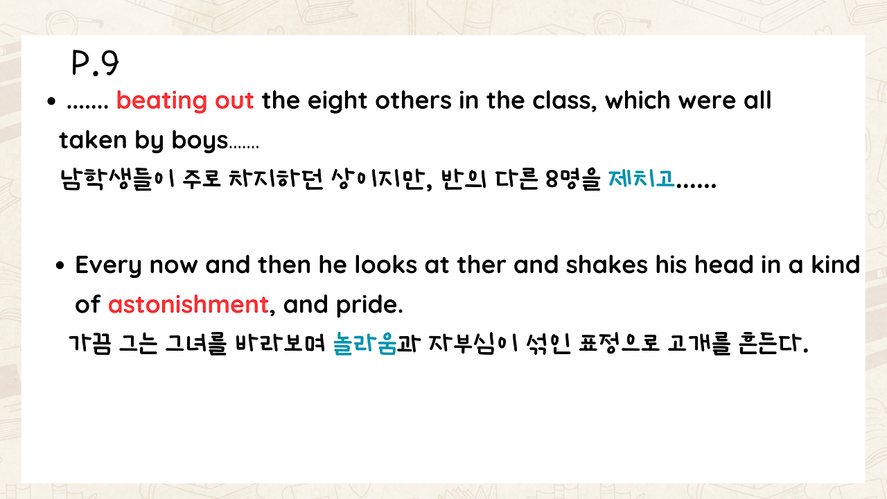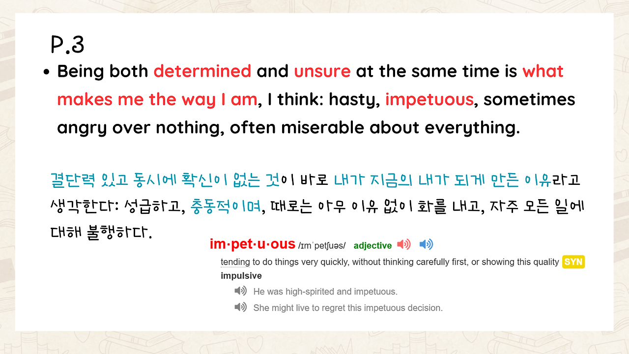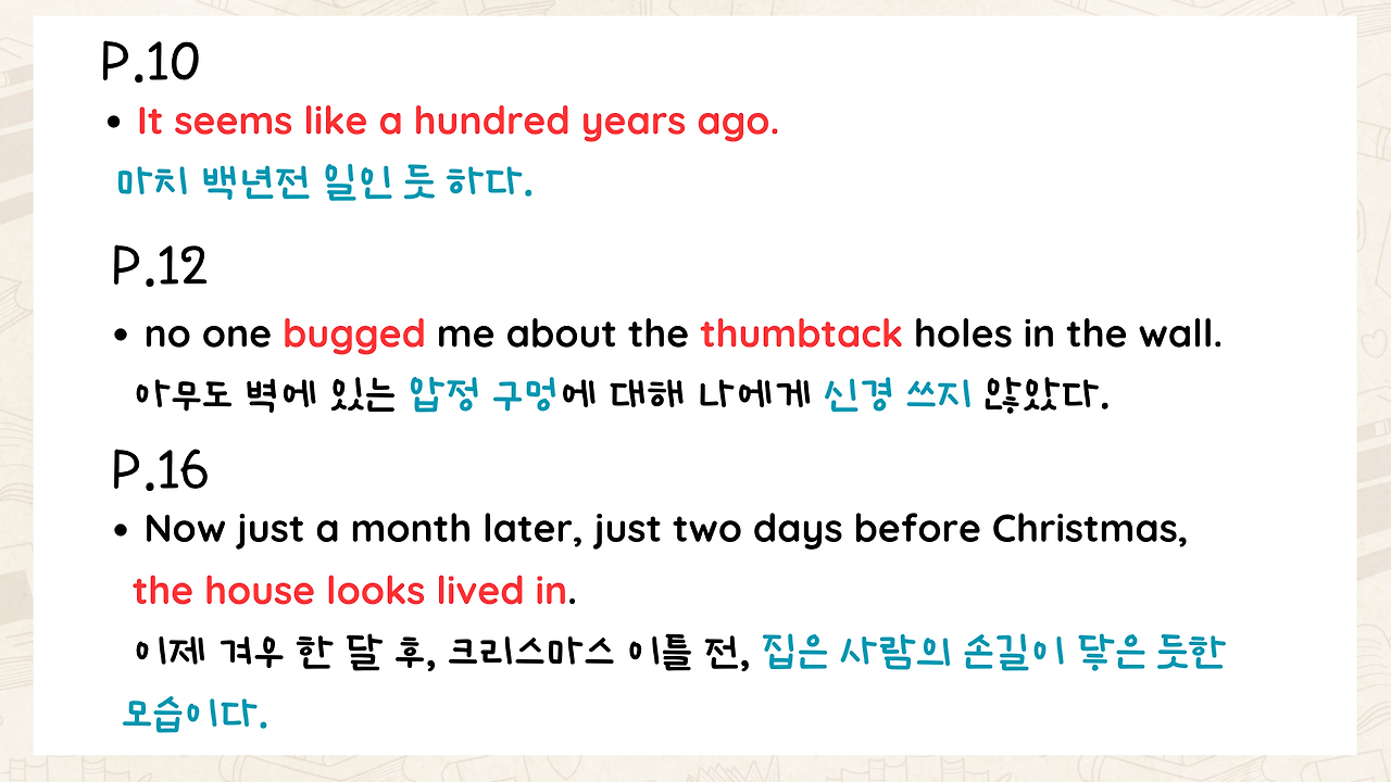 다소 긴 문장들이 많은 이번 소설이 약간의 도전을 주지만 해석이 힘든 부분이나 낯선 단어는 제가 최대한 정리해서 이곳에 공유할 예정입니다.