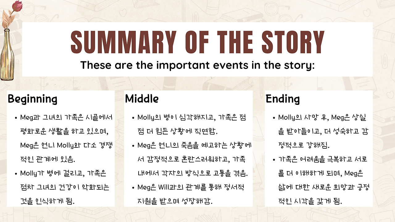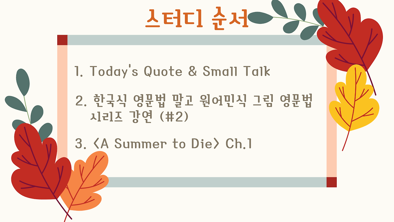 혹시 책 <A Summer to Die>를 가지고 계시면 Chapter 2를 2주간 읽어 보시길 추천 드려요~.
