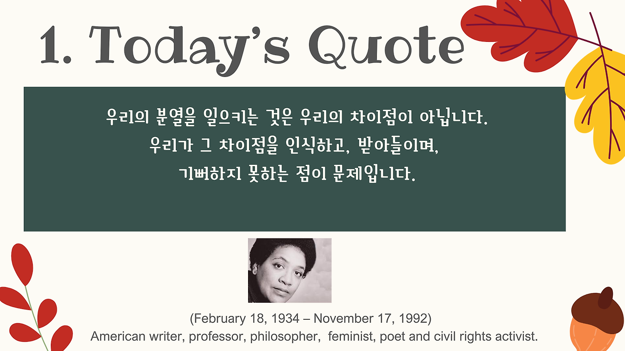 미국 흑인작가 이자 인권운동주의자인 Audre Lorde는 다름을 이렇게 바라보았습니다.