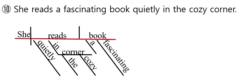 물론 주어, 동사, 목적어, 보어를 찾는 데는 도움이 되지만, 나머지 수식어구들과 그 어구들이 문장의 전체 구조에서 어떻게 연결 고리를 맺고 있는 지 한 눈에 파악하는 데 한계가 있습니다.