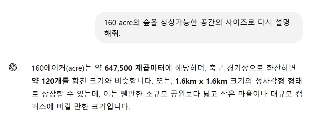 에이커는 익숙한 단위가 아니라 그 규모가 상상이 잘 안되어 오늘 스터디 끝무렵 구글을 해보고 그 규모에 대한 감을 얻고 싶었는데, 제가 다시 Chat GPT에게 의뢰하니 이렇게 말을 해주네요. ㅋㅋ