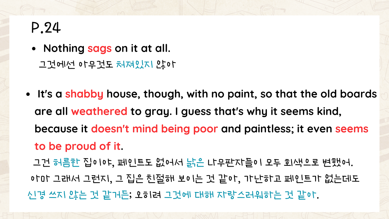 <A Summer to Die>의 chapter 2를 읽다가 검소함, 부유함에 대한 생각을 하게 되었습니다. 주인공 Meg 가족이 이사간 시골집에서 다소 떨어진 곳에 있는 이웃 집의 외관을 마치 사람인 듯 의인화 시키며 묘사한 부분이 나옵니다. 그 집이 오래 되었지만 자신의 모습에 대해 자긍심을 가지는 듯하다는 부분이 인상깊었습니다.⁶