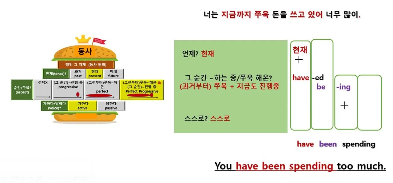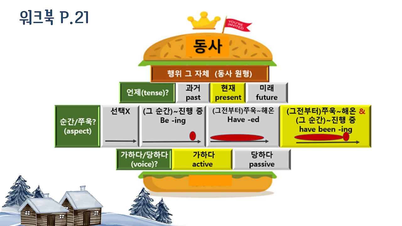 '영어 동사는 여러 재료층을 꾸~욱 눌러 앙 베어 먹는 햄버거와 같다.'