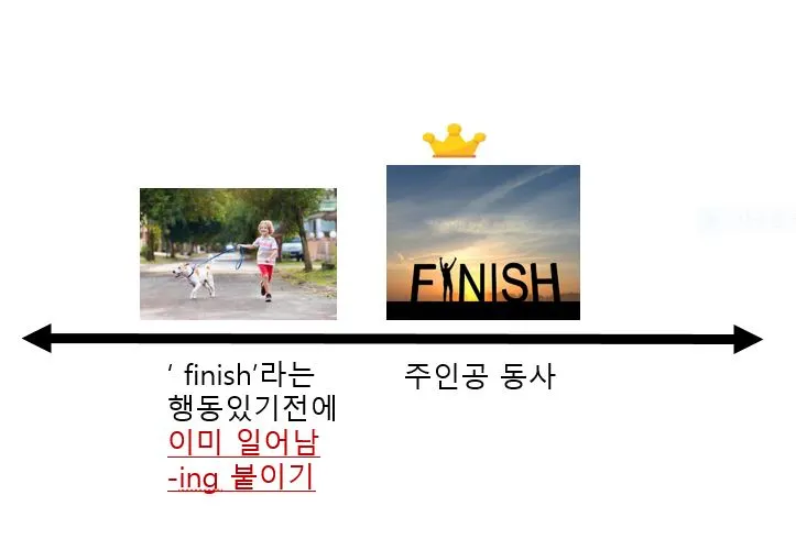 그래서 ‘나는 개 산책 시키는 걸 끝냈어’는 동사 원래 기본 형태 + 이미 하던 행동 (-ing) + 진행 중 +가하다’ 의 순으로 놓고, 꾹 눌러 압축시키면 ‘walking’이라는 형태가 나온다. 그래서 ‘나는 개 산책 시키는 걸 끝냈어’라는 문장은 ‘I finished walking a dog.’이 된다.