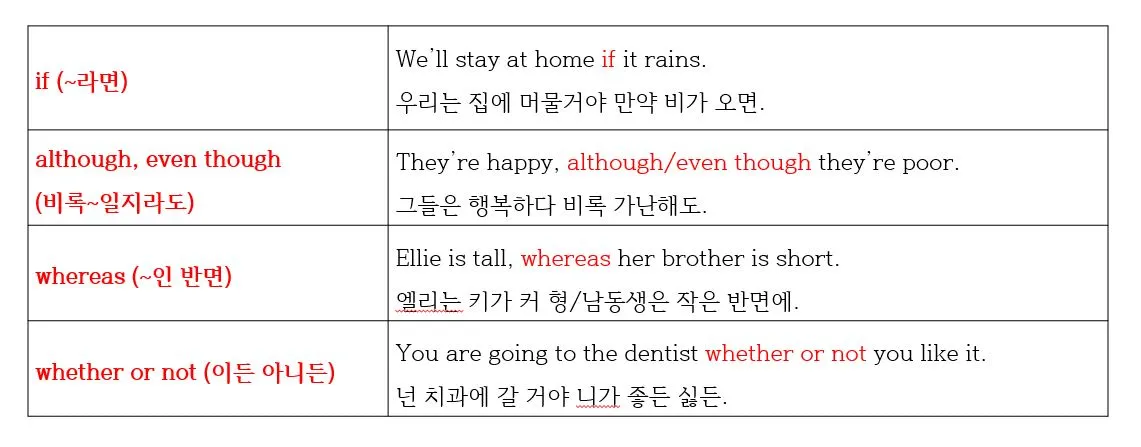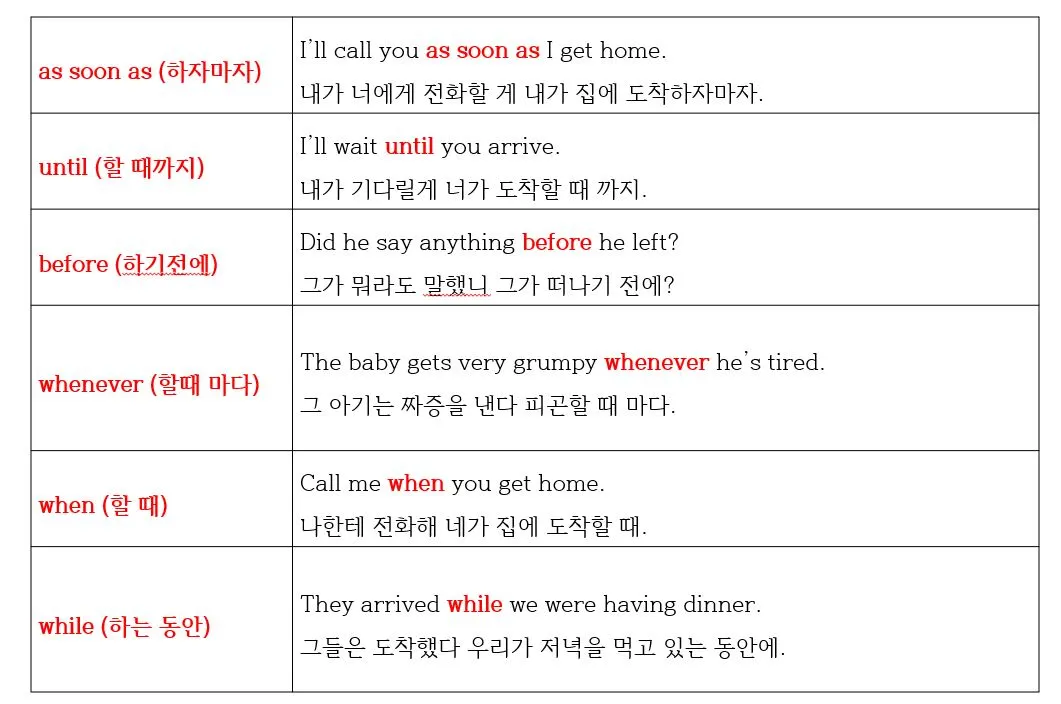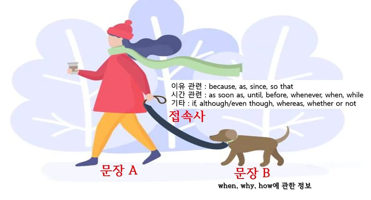 두 개의 나란한 문장 중에 하나는 시간, 이유와 같은 부수적인 정보(when, why, how에 대한 정보)일 때는 아래의 접속사 중 각각의 의미에 맞게 골라 쓴다.