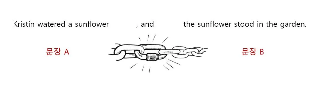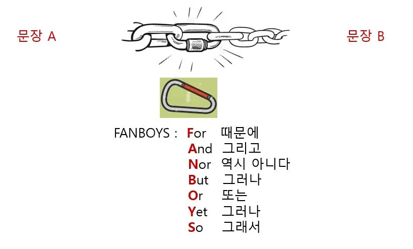 두 개의 낱개 문장을 하나의 문장으로 붙힐 때는 반드시 접착제가 필요하다. 이 접착제를 딱풀이라 부를 수도 있고 연결체인이라 부를 수도 있다. 하지만, 문법책에는 ‘접속사’라 불린다. 어렵게 들리는 용어지만 기본 기능은 ‘딱풀’이나 ‘연결체인’과 똑같다. 그 접속사(딱풀, 연결체인)의 종류를 많이 알고 적절한 것을 사용하는 것이 관건이다.