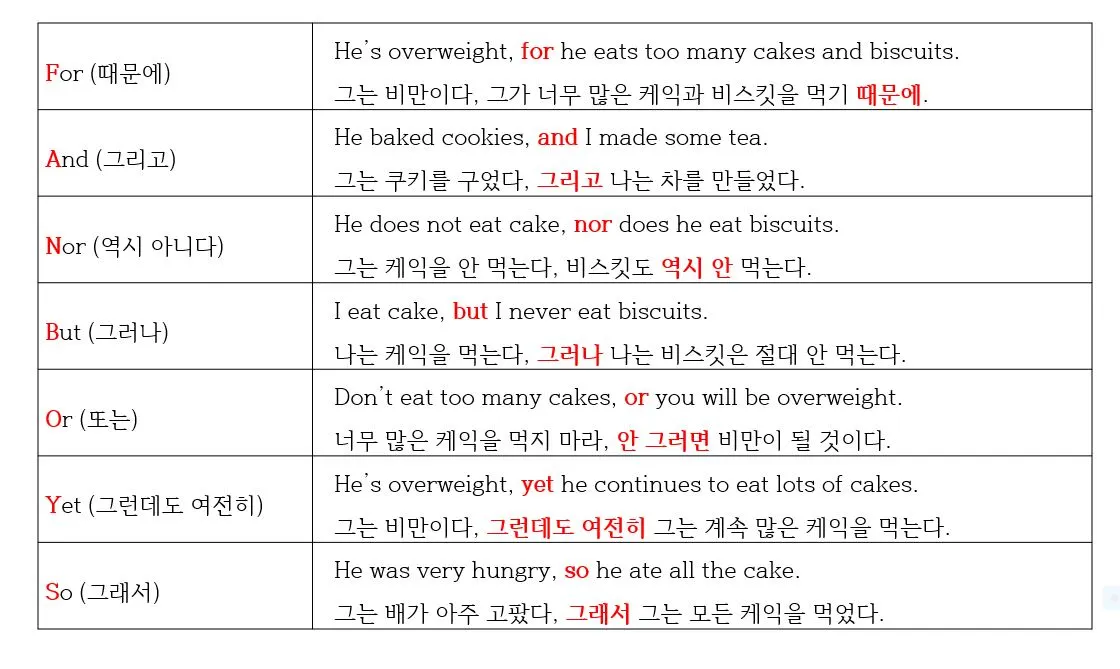 전하는 메시지의 중요도가 비슷한 두 문장을 연결해서 하나의 문장으로 만들 때, 아래의 접속사를 사용한다.