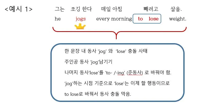 <예시1> 그는 매일 아침 살을 빼려고 조깅 한다.