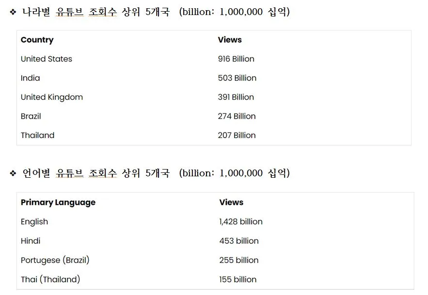 최근 가장 인기 있는 소셜 플랫폼 중 하나인 유튜브를 예로 들어 보자. You Tube 공식 인증 컨설턴트인 Alan Spicer는 자신의 홈페이지에서 나라별 및 언어별 유튜브 조회 수를 제시하였다. 그 중 상위 5개나라는 미국, 인도, 영국, 브라질, 태국이었다. 언어별 조회 수에서는 영어(1,428 billion)가 나머지 세 개 언어(인도어, 포르투갈어, 태국어)의 조회 수를 합한 것(863 billion)보다 거의 두 배 가까이 많은 것으로 나타났다.