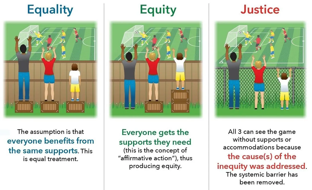 교육에서 모든 문제의 핵심은 공평함과 공정함, 그리고 정의로움이다. 사전의 정의에 따른다면 '공평(equality)'은 '어느 쪽으로도 치우치지 않고 고름'을 뜻하고 '공정(equity)'은 '공평하고 올바름'을 뜻한다. 아래 그림을 예로 들어 설명하면 나무 펜스 너머로 키가 서로 다은 세 사람이 축구 경기를 본다고 해보자. 키가 아주 큰 사람, 보통인 사람, 아주 작은 사람에게 키와 상관없이 같은 높이의 발 받침대를 하나씩 모두에게 주는 공평(equality)을 발휘한다고 해보자. 키 큰 한 사람은 나무 팬스 너머로 축구 경기를 관람할 수 있다. 하지만 나머지 두 사람은 받침대 하나로는 부족하다. 그래서 그 둘에게 발 받침대를 1~2개씩 키에 맞게 더 주는 공정함(equity)을 발휘할 경우에서야 비로소 그들도 그 경기를 볼 수 있다. 하지만, 애초에 이런 사태를 예견하고 그 펜스를 구멍이 숭숭 뚫린 펜스로 설치했었으면 어땠을까? 키에 상관없이 모두들 펜스 너머로 경기를 볼 수 있게 한 정의로움(justice)이 있었으면 얼마나 좋았을까? 교육은 결국 정의로운 세상을 만들기 위해 존재해야 한다.