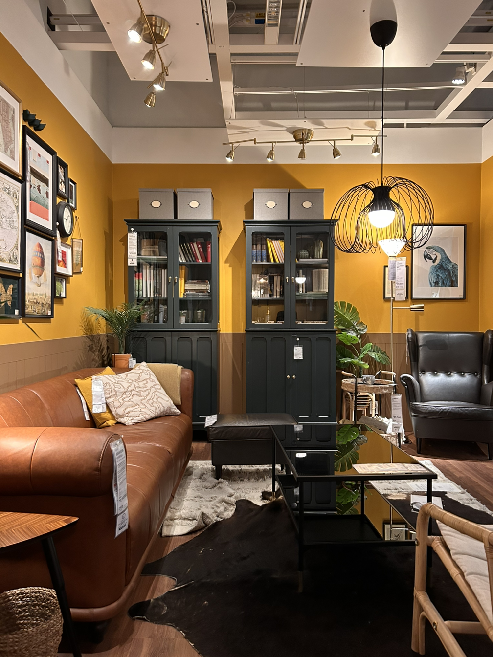 이케아는 한눈팔기 너무 좋은 곳이다. 예쁜 쇼룸들을 보며 내 미래의 집을 머릿속으로 상상해 봤다. 특히 마음에 들었던 쇼룸은 예쁜 노란 벽이 있는 거실이었다. 벽과 진한 초록색의 가구가 너무 잘 어울렸다.