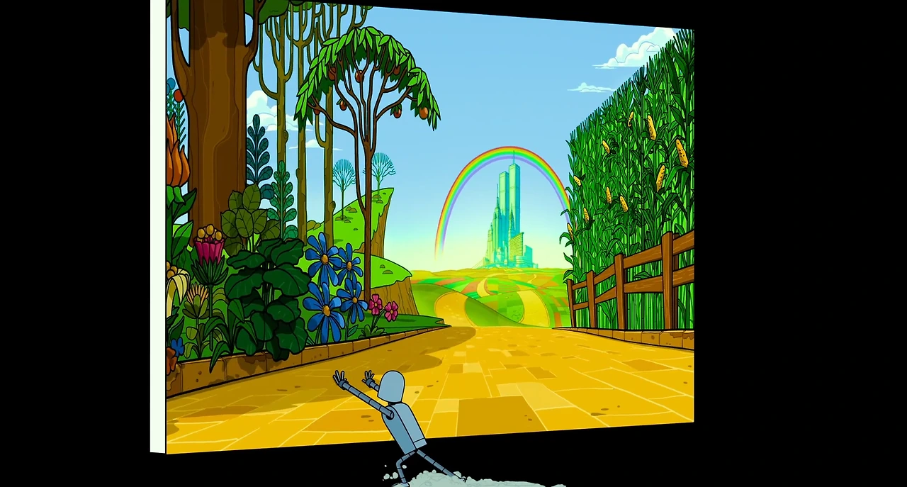 *오마주(hommage): 타 작품의 장면이나 스타일을 존경의 의미를 담아 의도적으로 인용하는 것이다. <로봇 드림>은 포스터와 스틸컷 등에서도 오즈의 마법사를 오마주하고 있음을 확인할 수 있다.