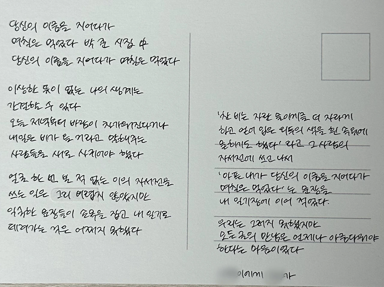 윤: 일단 작년에 시 선물을 받은 게 처음이었다. 그래서 ‘시도 선물할 수 있구나, 되게 신선하다.’라는 생각이 들었다. 이게 계기가 돼서 나도 시를 선물할 생각을 하게 된 것 같다. 게다가 원래 필사를 좋아하기도 해서, 내가 좋아하는 것을 나눌 수 있는 좋은 기회라고 생각하기도 했다.