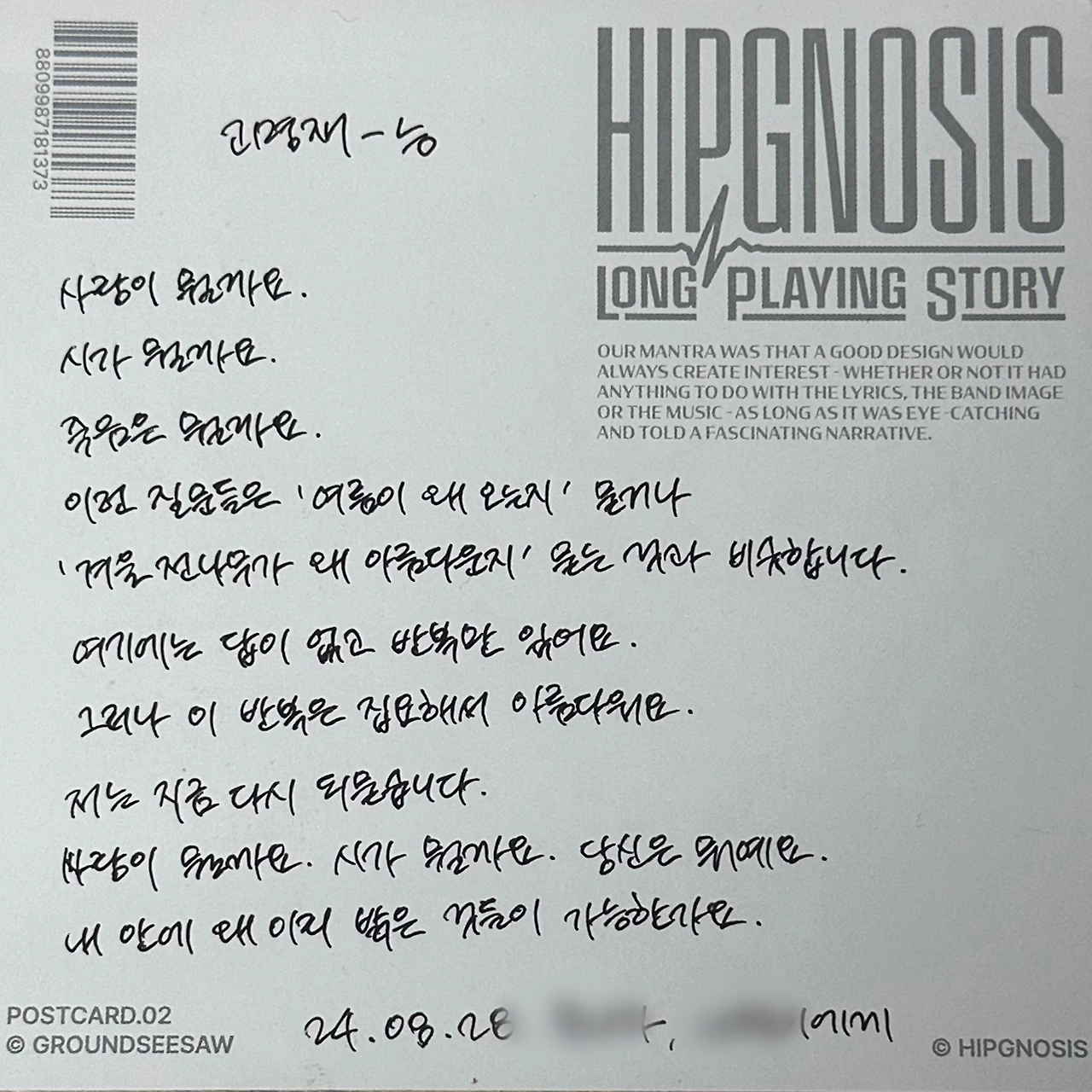 윤: 사실 그 이후로 ‘시 나눔 리스트’가 생겼다. 한 13명 정도? 지금 1차, 2차까지 진행했고…. 너무 자주 주면 받는 사람들의 감흥이 떨어질까 봐 요즘은 좀 자제하는 중이다. (캉: 아, 그런 것까지 고려를…!)