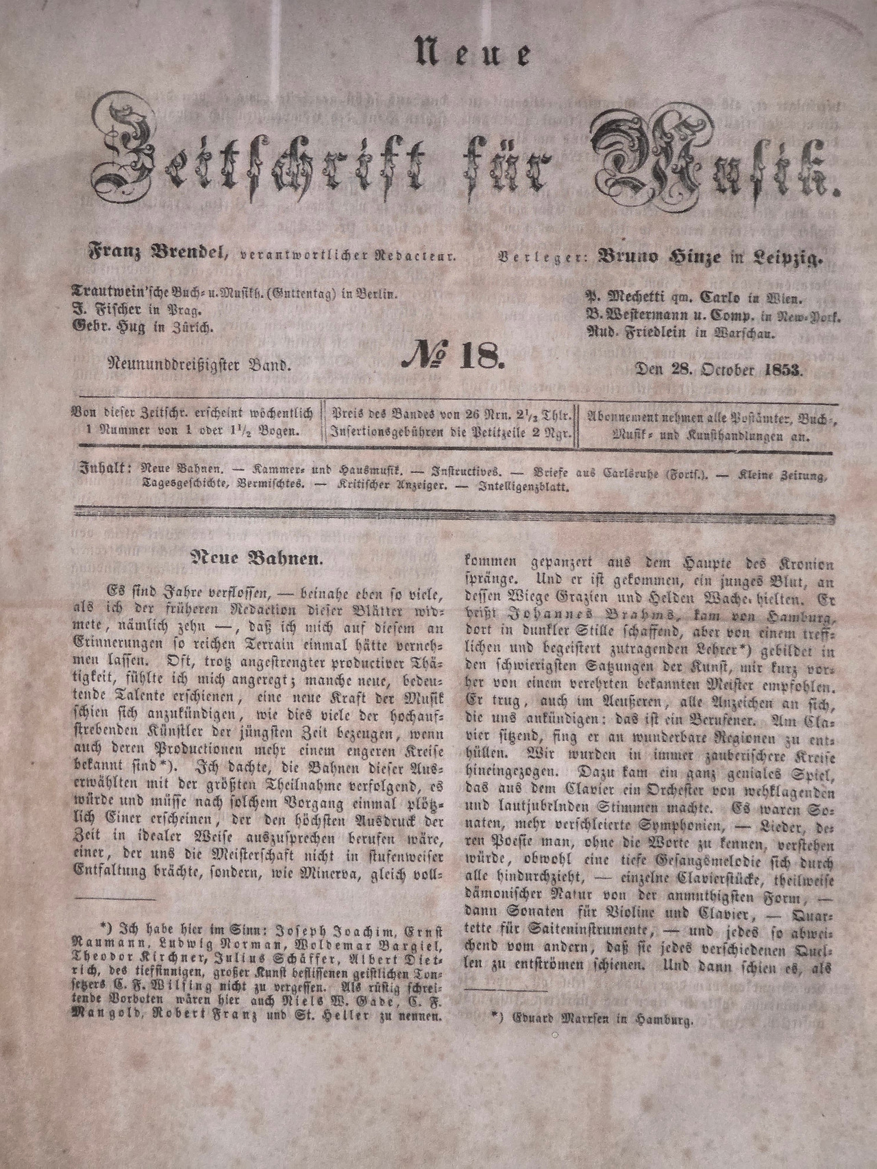 행복했던 뒤셀도르프 생활을 마치고 하노버로 떠난 브람스는 곧 슈만이 보낸 깜짝 선물을 받게 된다. 바로 슈만이 창간한 '음악신보(Neue Zeitschrift für Musik)'에 자신을 소개하는 글을 기고한 것이다.