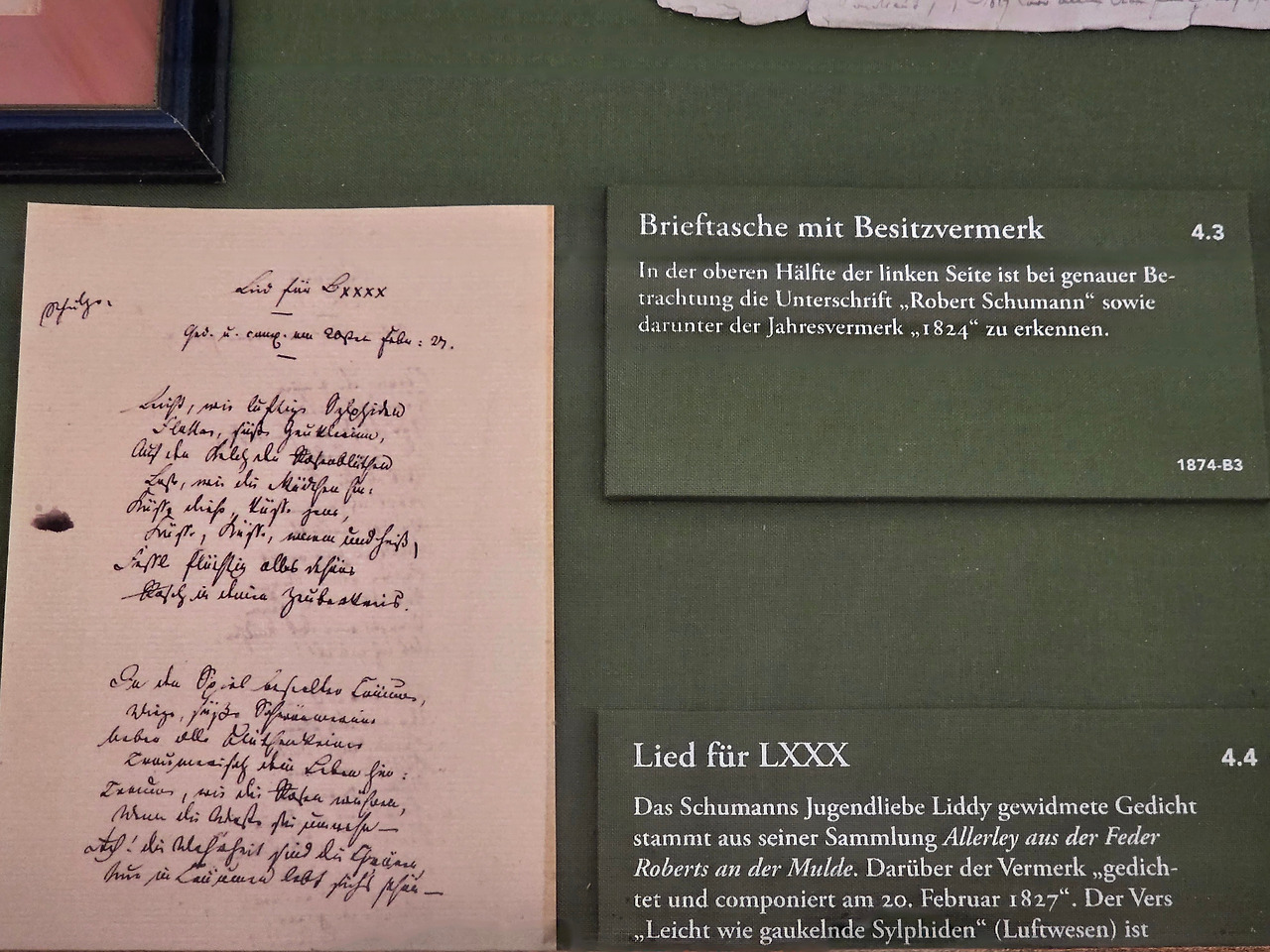 특히 스위스에 살던 슈만의 딸, 마리 슈만이 로베르트와 클라라의 소중한 유품들을 대거 기증해 준 덕분에 이곳의 전시는 놀라울 만큼 생생했다. 예를 들어, 슈만이 실제로 사용했던 책장이 특별한 보호막도 없이 무심하게 전시되어 있었는데 이는 마치 그가 잠시 자리를 비운 듯한 느낌이 들었다.
