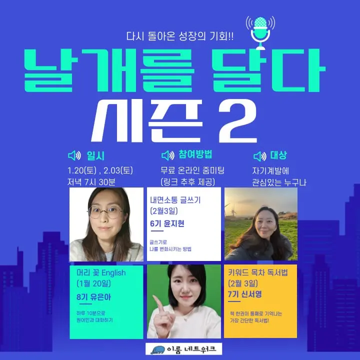 날개를 달다 시즌 1에서 주최하는 인생을 바꾸는 기록법, 글쓰기, 독서법 강의를 들었다. 강의 후 열린 소모임에 참여하여 글쓰기와 독서를 실천을 하기 시작했다. 나의 영어 경험을 나누고 도움이 되고 싶다는 마음이 꿈틀거리기 시작했다. 그러다 '퍽'하고 단톡방에 영어 강의를 하고 싶다고 신청을 했다. 나의 배경에 관한 지식이 전무한 상황에서도 멘토분들은 흔쾌히 제안을 받아들여주셨다.