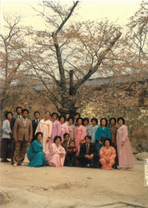 서울 경복궁 경내에 있는 국립민속박물관 앞에서 어머니 아버지들이 포즈를 취하고 있다.